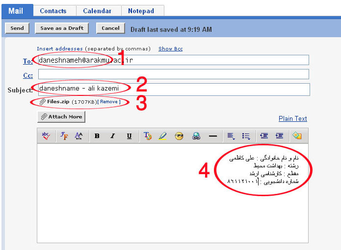 فایل فشرده حاصل (که شامل تصویر مدارک می باشد) را به ایمیلی با موضوع "daneshnameh - name" به جای (name) نام و نام خانوادگی خود را تایپ نمایید، پیوست نموده و در متن ایمیل مشخصات خود شامل نام و نام خانوادگی ، رشته ، مقطع و شماره دانشجویی و شماره تماس ( ترجیحا" تلفن همراه) را وارد کرده و به آدرس "daneshnameh@arakmu.ac.ir" ارسال نمایید. (مانند شکل زیر)
